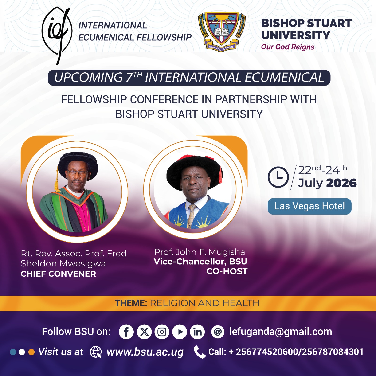 This conference is slated for 22th – 24th July 2026. The theme of the conferences is: Religion and Health. It follows six IEF conferences. The first one was held at Uganda Christian University-Mukono from 13th-14th February 2010 under the theme “Religion, Peace and Development”. The second one was held at Bishop Stuart University Mbarara, Uganda from 10th-11th January 2013 under the theme “Healing wounded history”. The third one was held at Tangaza in Nairobi Kenya from 26th – 28th May 2016. The fourth and fifth were held at Lake View Resort Hotel in Mbarara City Uganda from 8th– 9th August 2018 under the theme “Unity in Diversity” and from 1st -2nd September 2022 under the theme “Reconciliation and Restoration; the how for African Refugees” respectively. The 6th conference was held at Las Vegas Hotel in Mbarara city Uganda from 15th to 17th August 2024 under the theme “Religion and Development”